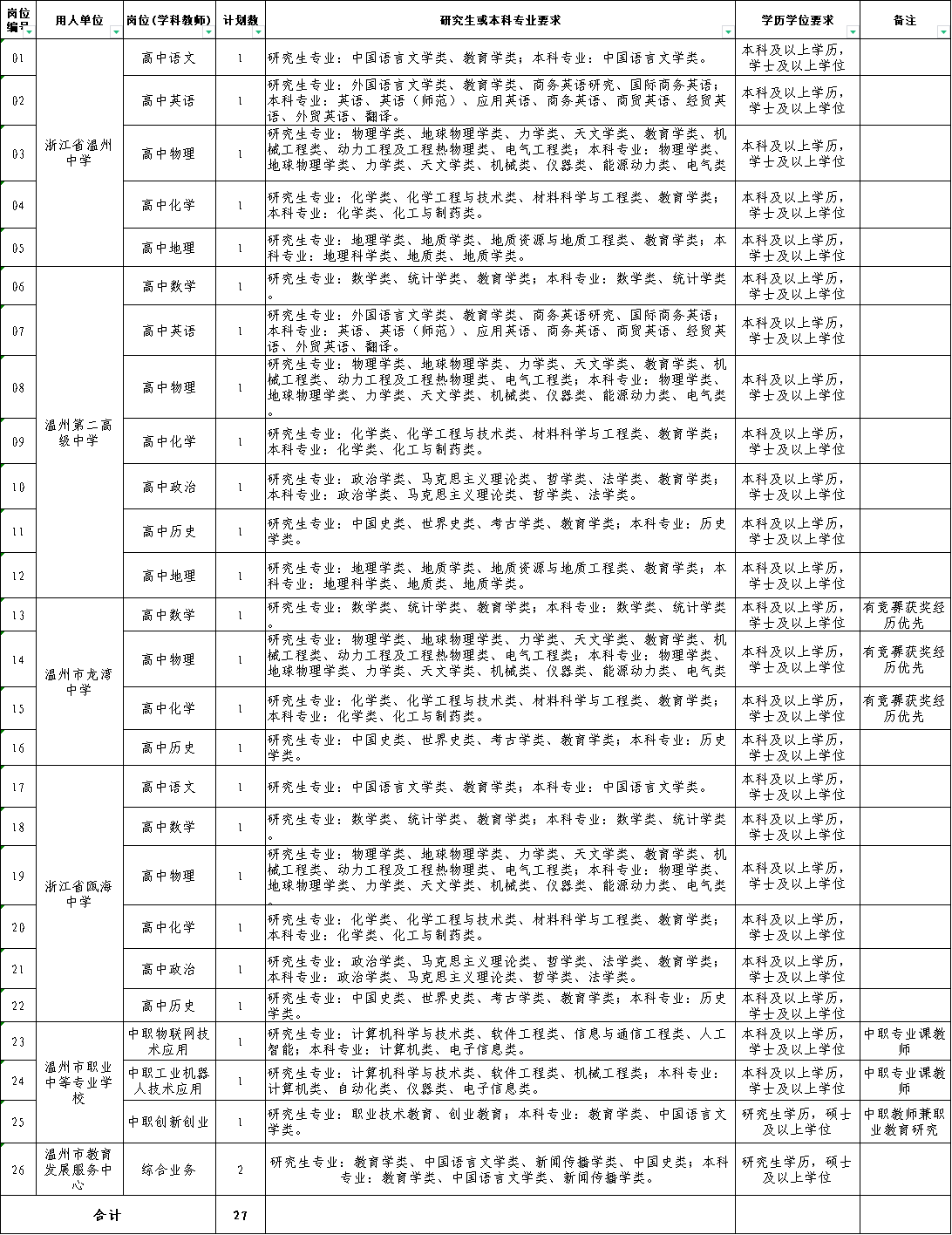为深入实施人才强教战略,努力打造温州教育高地,打响“好学温州”和“来温州·创未来”品牌,经温州市人力资源和社会保障局同意,温州市教育局直属公办学校(单位)决定面向优秀高校毕业生公开选聘事业编制教师和工作人员27名。现将有关事项公告如下。